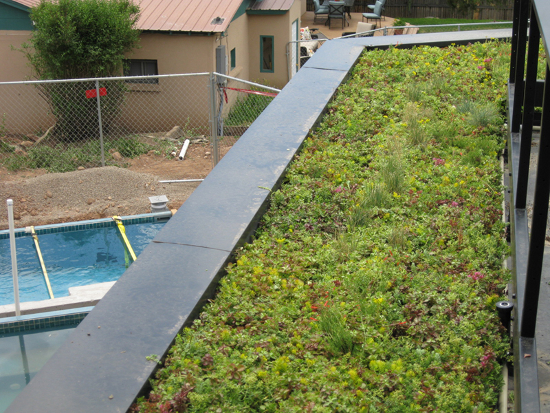 A street in San Diego offers a gorgeous rooftop patio. A verity of plant mixes adds an appealing aesthetic to this green roof.