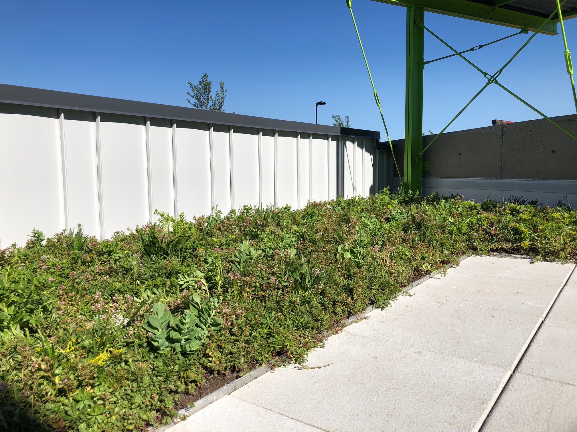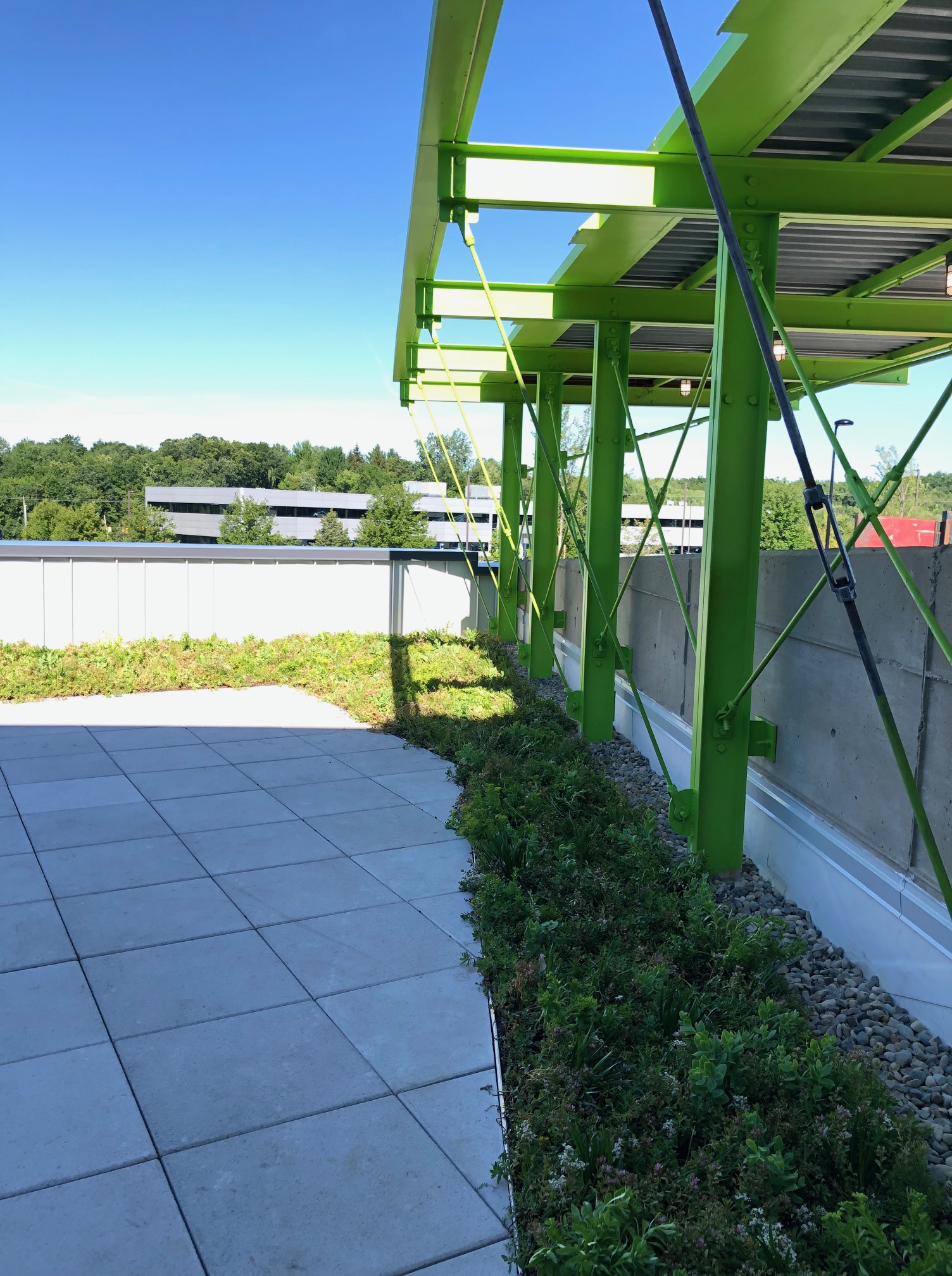 Second story windows overlook a mixed meadow on the dining room roof.
