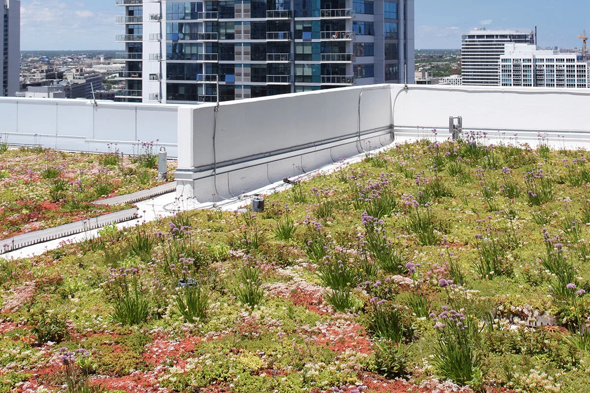 The Hyatt House in Evanston, IL features a beautiful green roof. The living roof features a mix of evergreen and deciduous succulents.