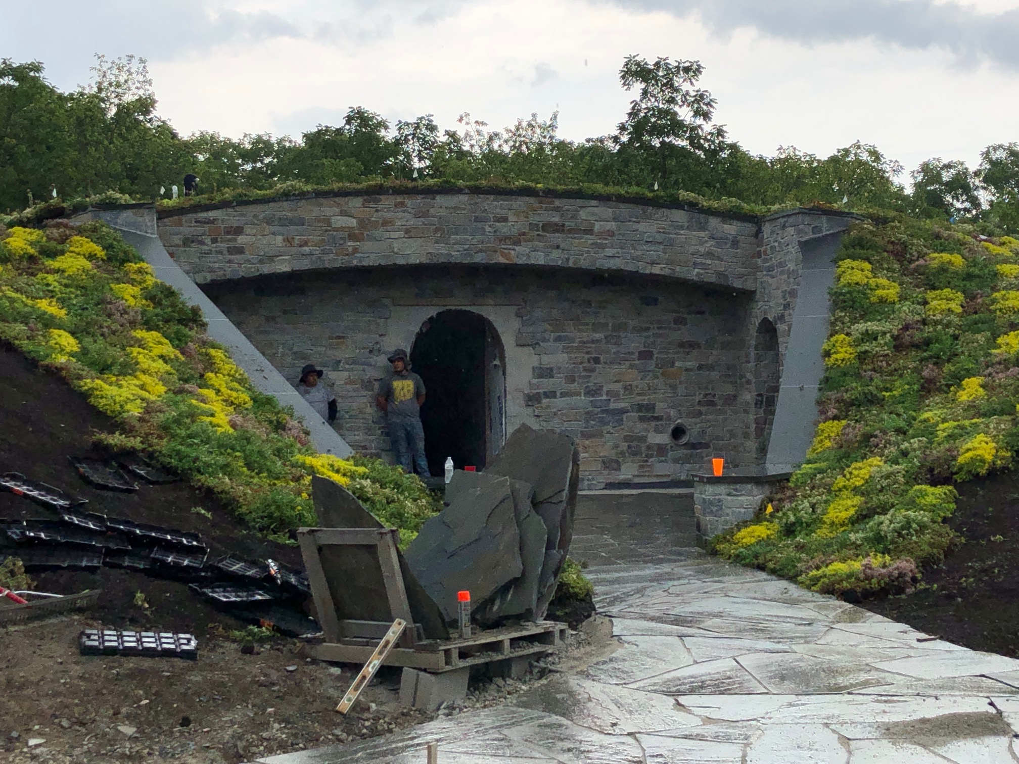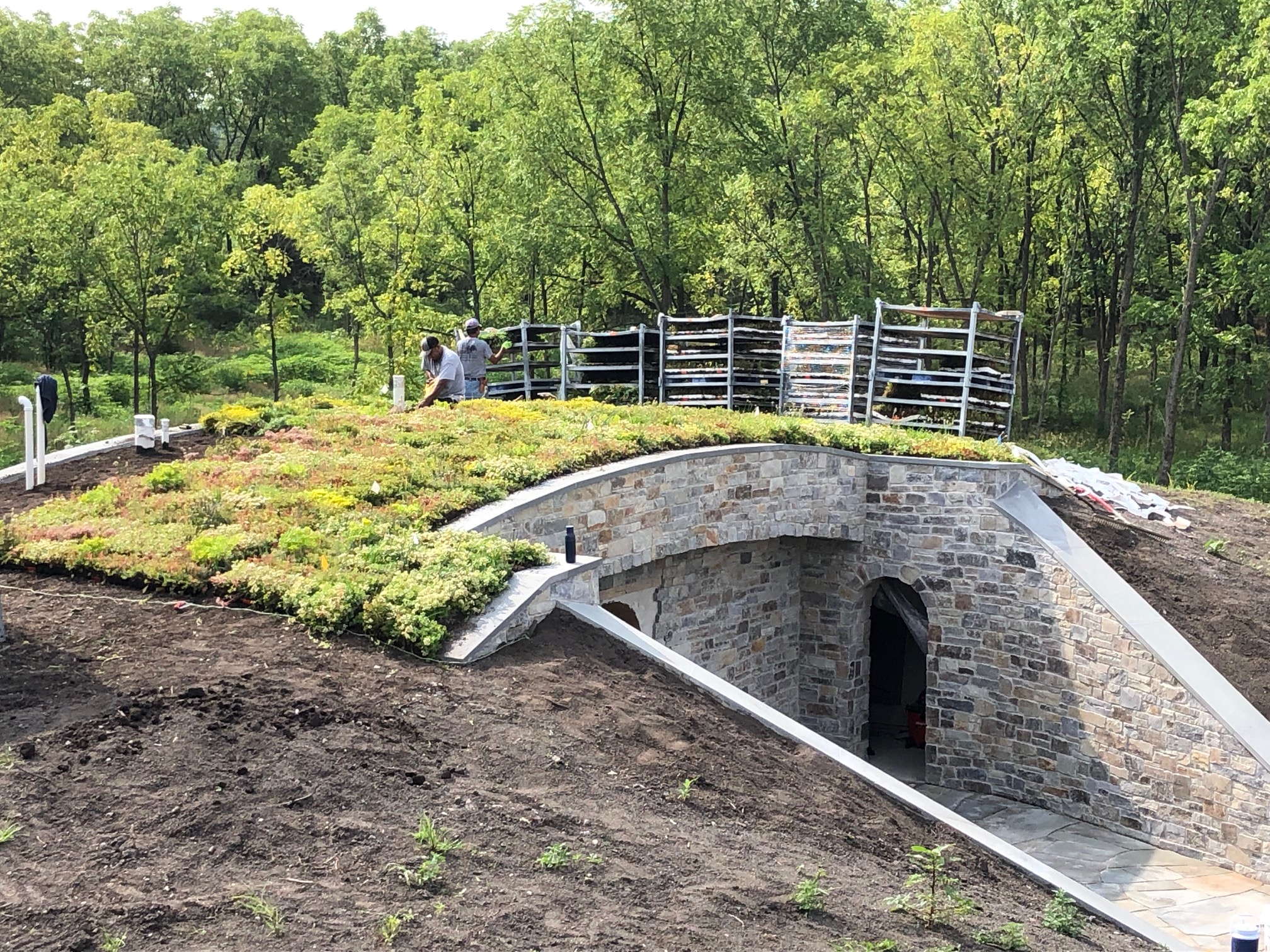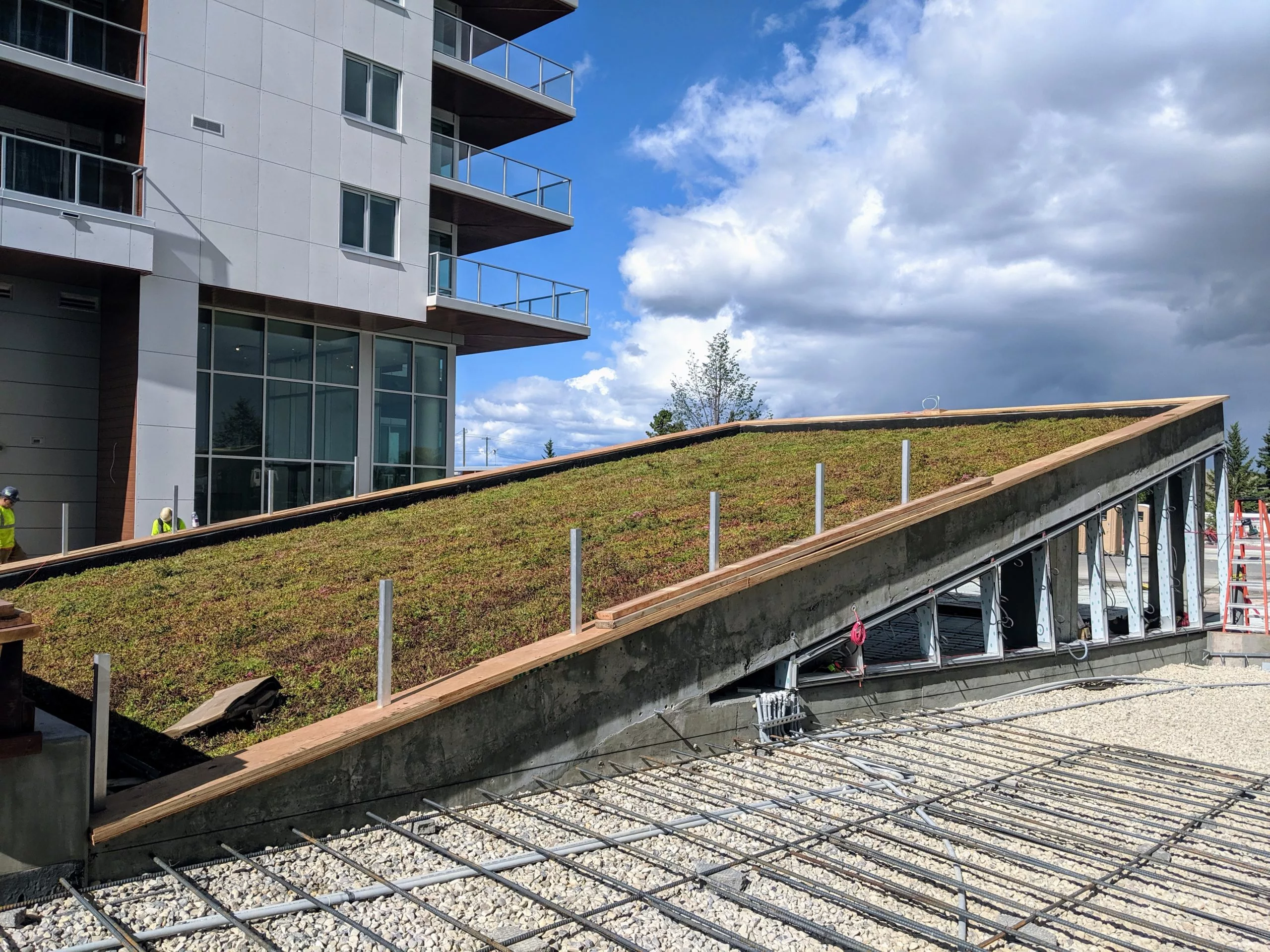 Sloped 3/12 pitch above the entry to parking garage – Plant blend is our prairie tough broad blend of sedums
