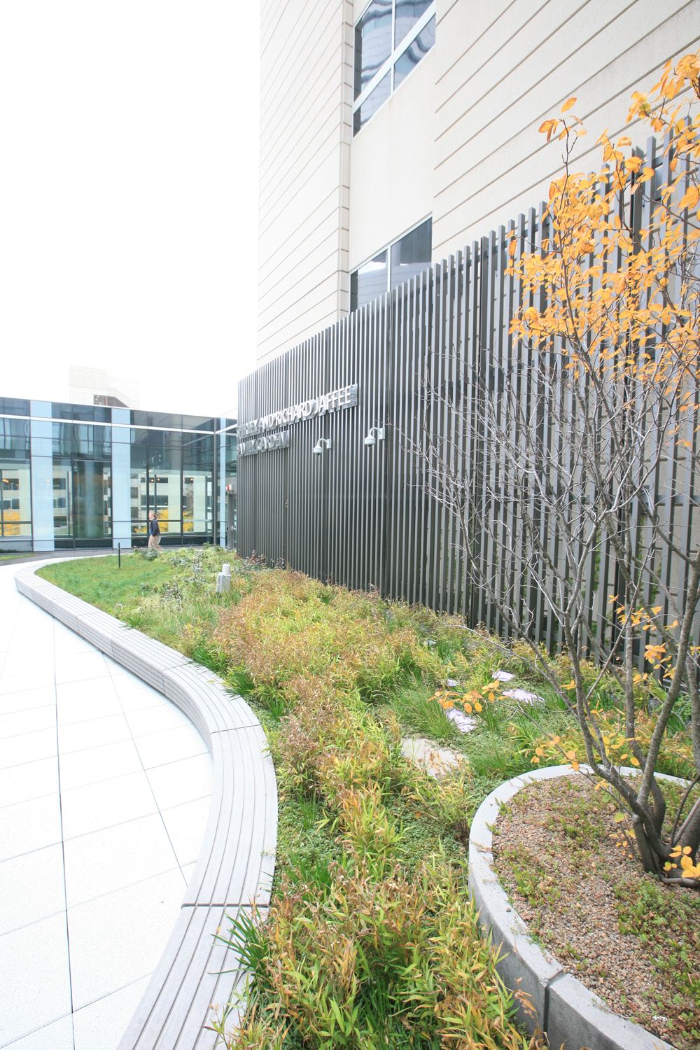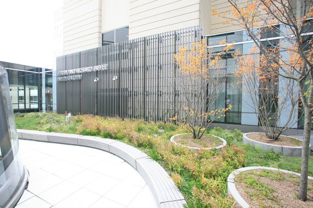 This green roof project has been planted with shade loving perennials and groundcovers. The Baseball Diamond” pattern is created with differing heig”””