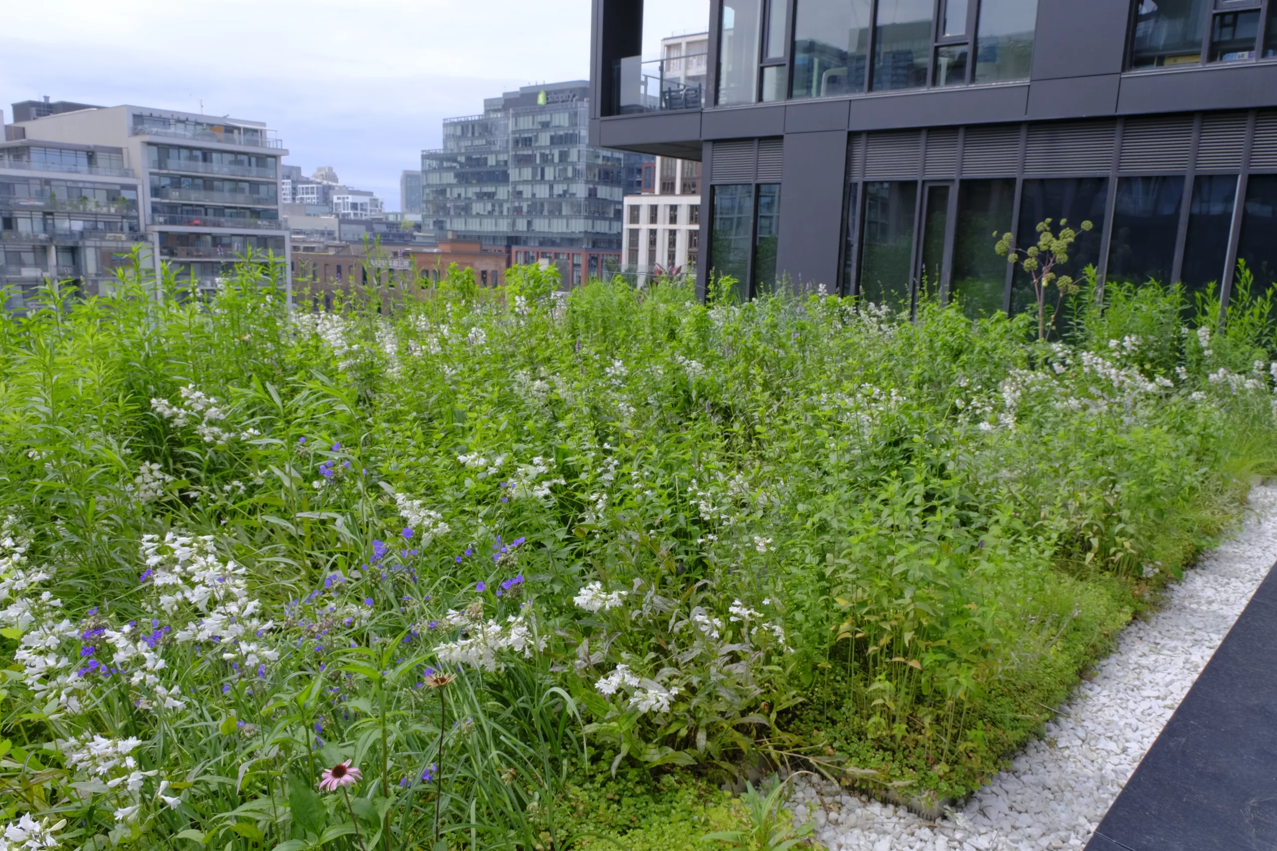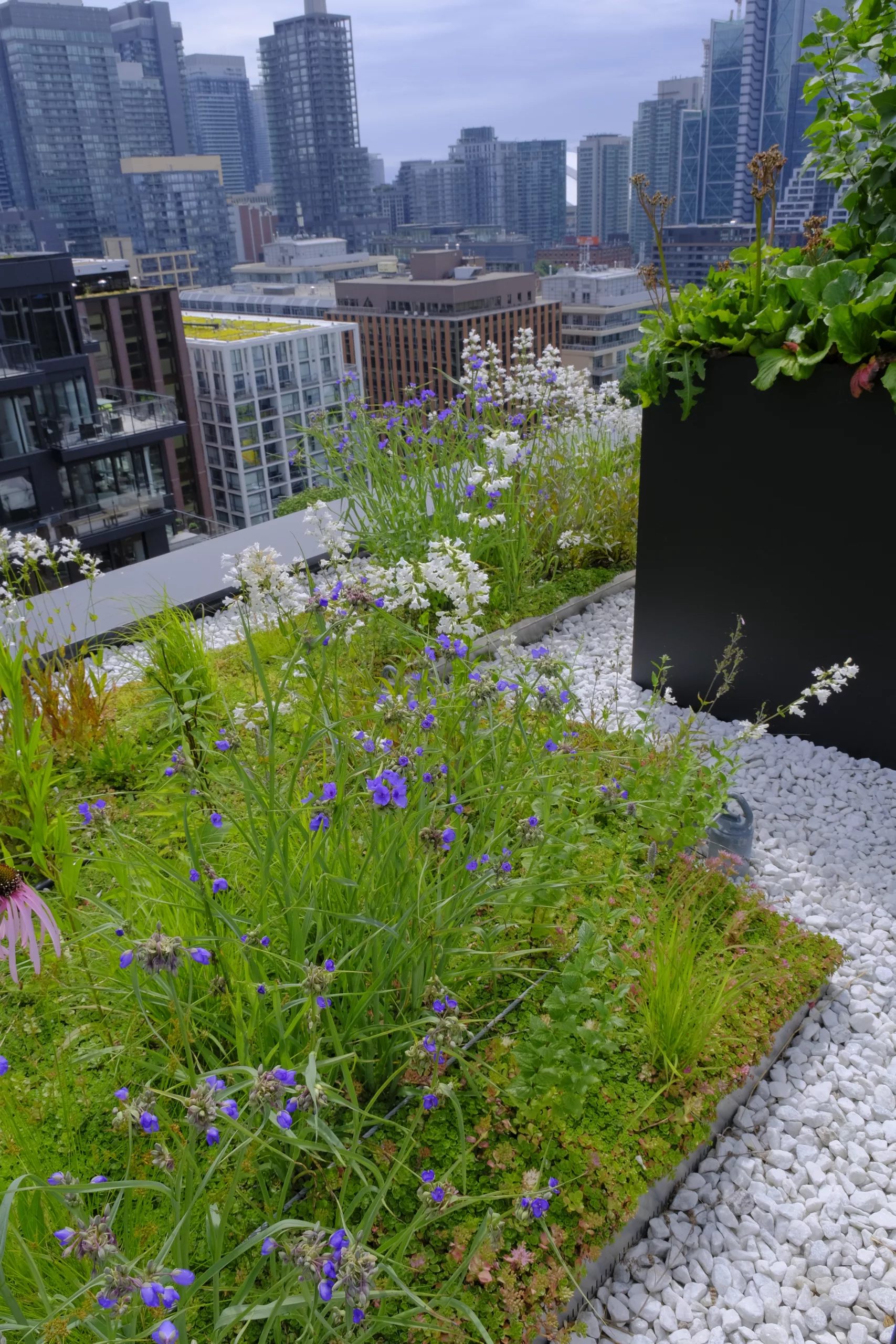 Residential second story irrigated sedum mixes over first story addition next to backyard pool
