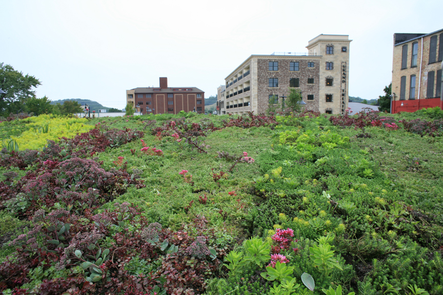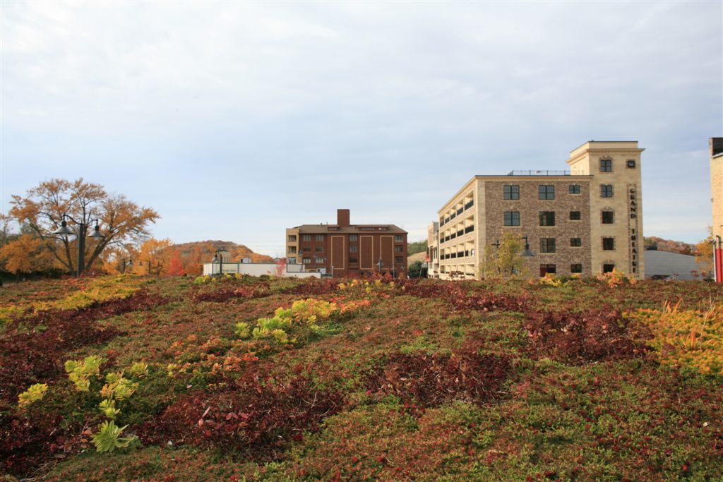 Mixture of sedums provide wide range of textures, colors and blooms with narcissus and sisyrinchium to add height and seasonal interest.