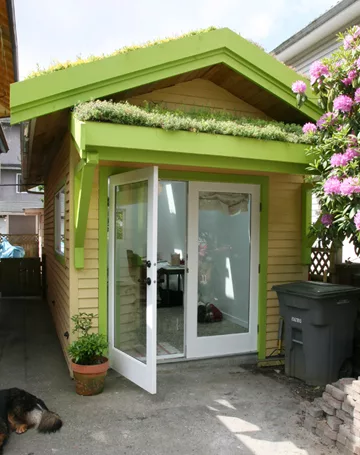 This tool shed was remodeled into a home office. LiveRoof was installed on the existing gabled roof as well as the shed roof added over the entry.