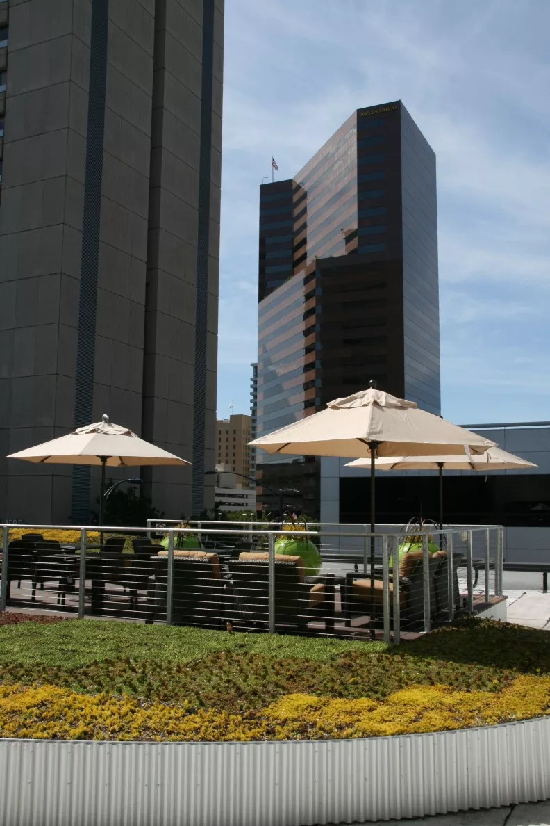 A street in San Diego offers a gorgeous rooftop patio. A verity of plant mixes adds an appealing aesthetic to this green roof.