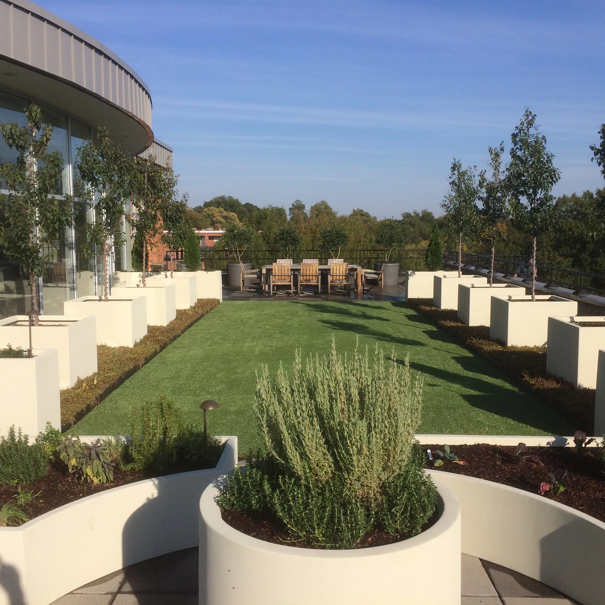 Combination of LiveRoof Modules, Containerized Plants and Artificial Turf.