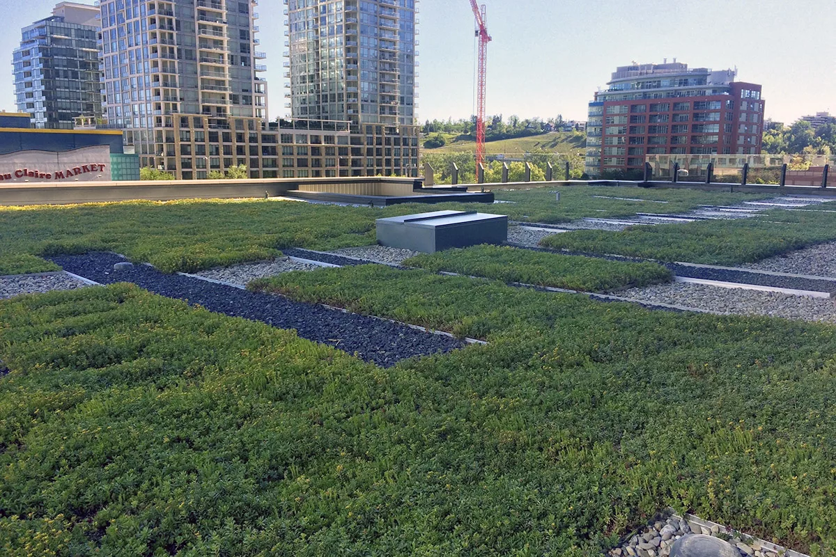 This Extensive Green Roof project Features roughly 26,000 square feet over 4 roof levels. The second level roof is visible to the public through Calgary’s plus 15 network.