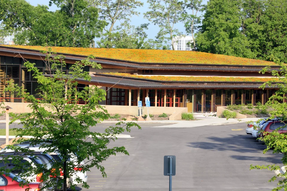 This award-winning structure (2011 AIA/COTE Top Ten Green Projects) was designed to accommodate a growing congregation that worshiped in a Frank Lloyd Wright historic building. The green roof’s organic shape and evolving plant palette are a focal point of the new structure.