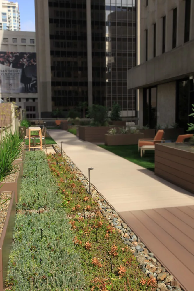 This outdoor patio is accented perfectly with a LiveRoof living roof.