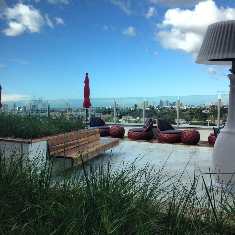An outdoor grill and patio area is accented with this LiveRoof green roof in La Brea California.