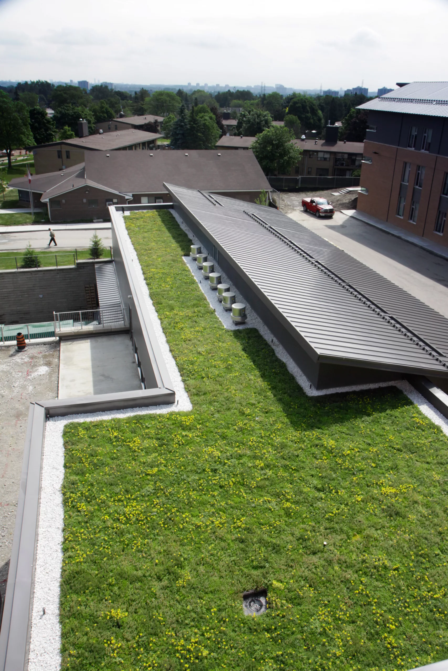 Kipling Acres LTC is a large longterm care facility owned by the City of Toronto. Phase 1 of the re-development includes green roofs on 15 different roofs. One roof area is accessible from the 3rd story lobby. The vegetated roof over the nursery is very visible for most residents on the north and east side of the buildings. The 2,400 square metres of living roofs significantly reduces the storm water runoff from the facility as it covers more than 50% of the roof surface of the building.
