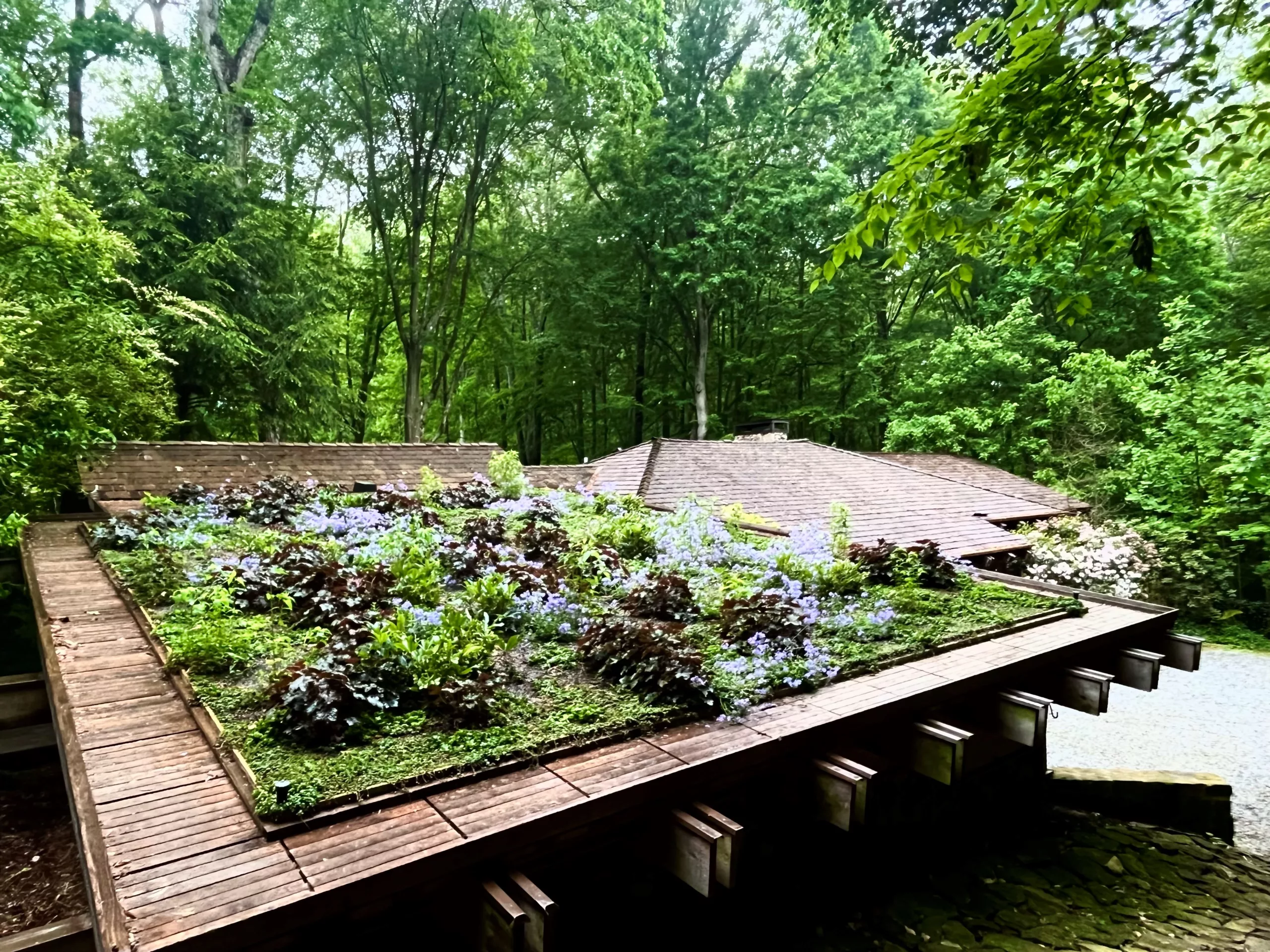 This residential project looks beautiful all year round and includes a variety of sedums and larger plant species for added texture. The blueish green plant selection provides a cohesive monochromatic color scheme that contrasts the warmth of the wooden decking pavers.