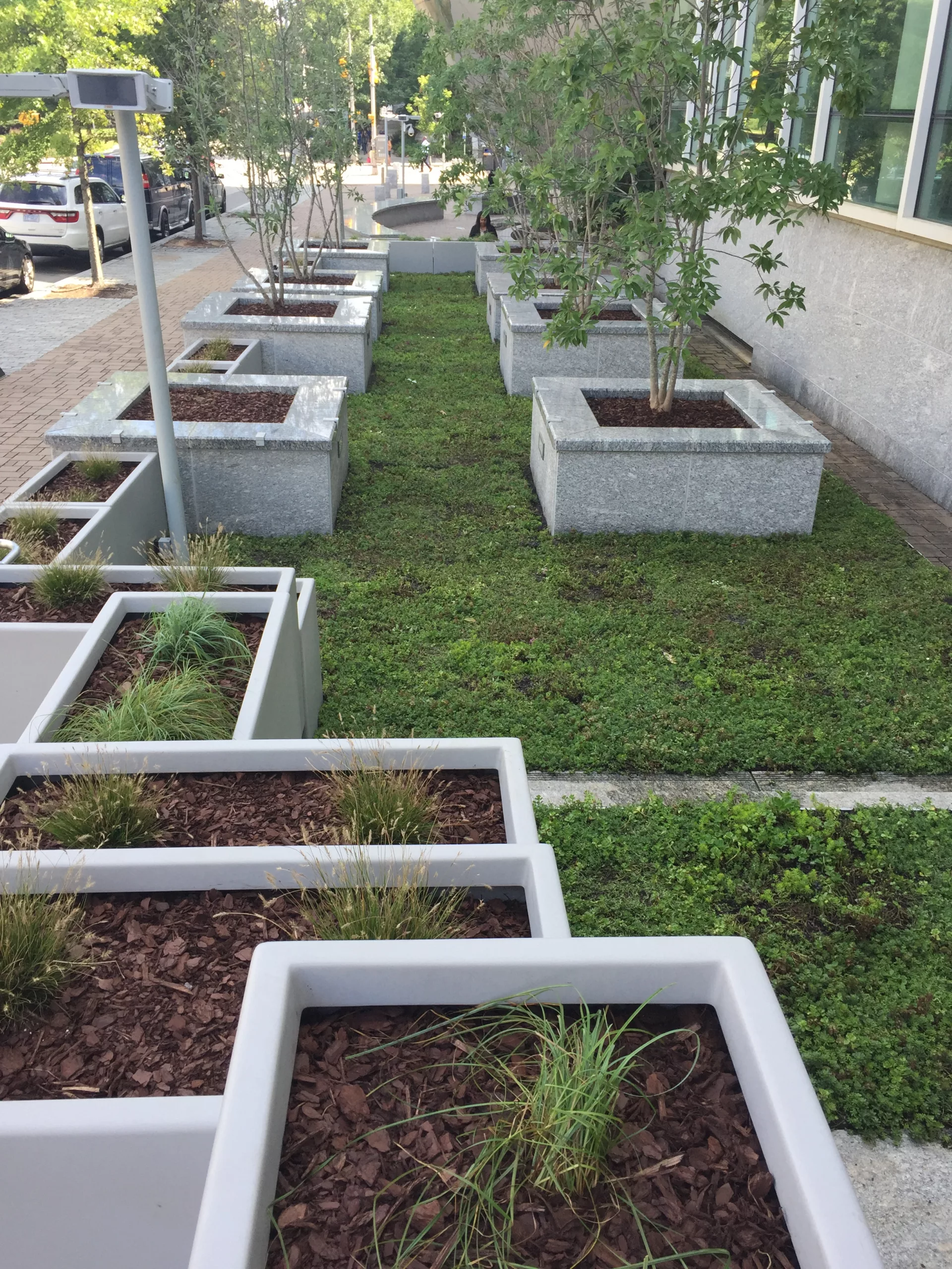 Nature Research Center in Raleigh, NC installed a green roof system near the sidewalk. The LiveRoof system is visible to the public.