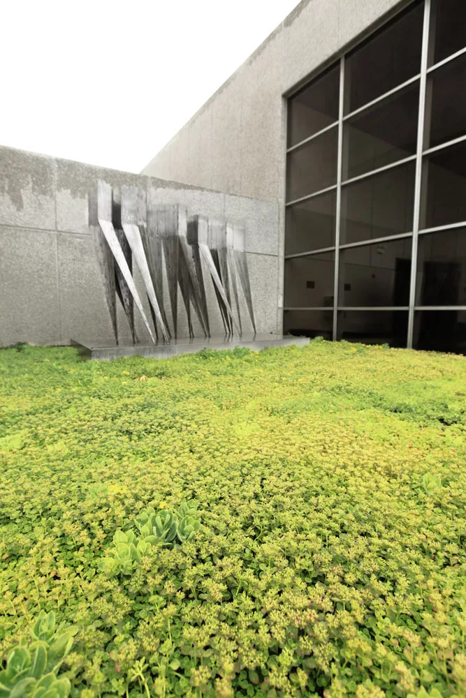 Nortwestern’s Bienen School of Music is home to this beautiful green roof. The 456 square foot living roof’s organic textures contrast well against the angular metal sculpture.