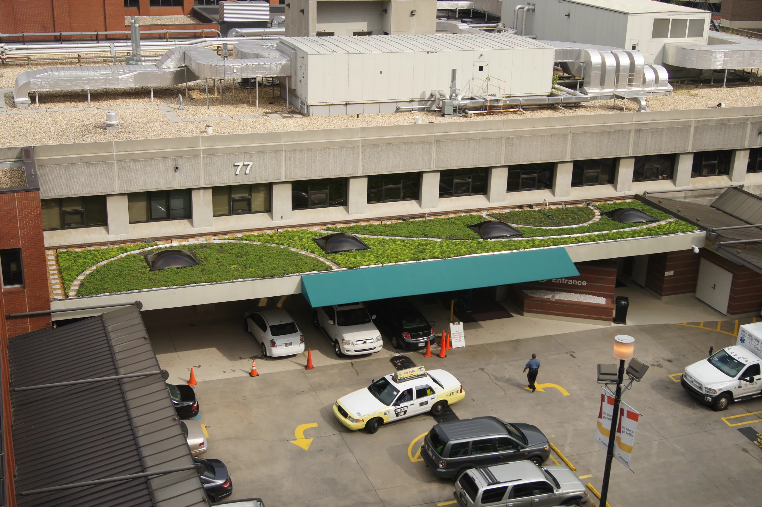 The Piedmont Hospital Emergency Room green roof was installed in 2012 and is one of our first commercial green roofing projects in Georgia. The roof, visible from multiple areas of the hospital, contains curved walkways, light wells, and Allium accent plants.