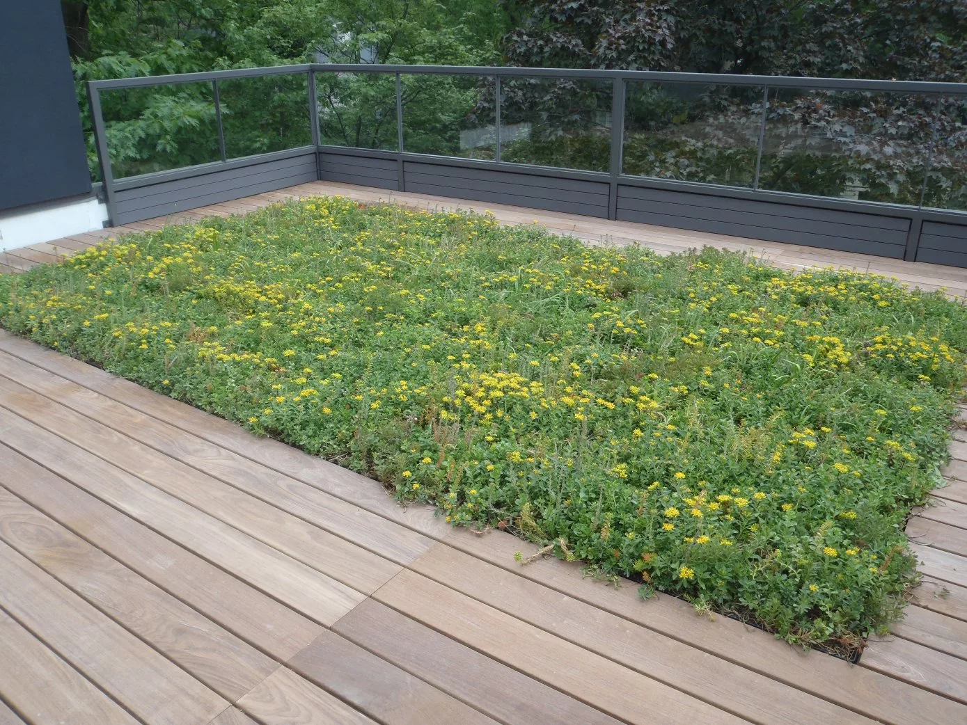 The LiveRoof system creates a rooftop oasis on this private residence in Toronto, Ontario. The vegetated roof covers 140 square feet.
