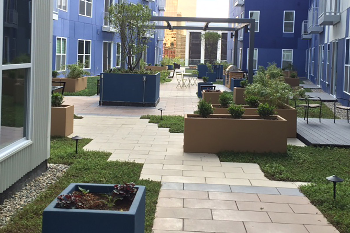 Pulliam Square located at the top of a residential apartments that gives the residence a place to go outside at their building