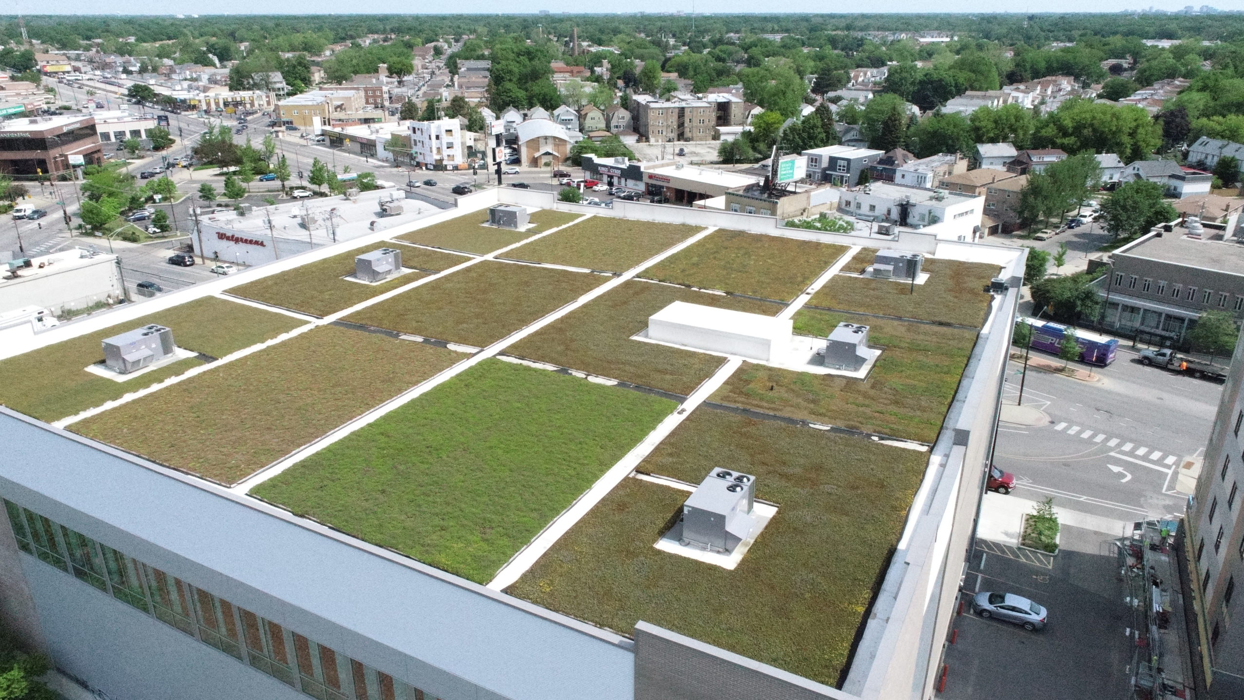 Four distinct Sedum blends laid out to mimic a Tartan pattern with solar Reflective RoofStones as the white stripe. Design by IBI Group.
